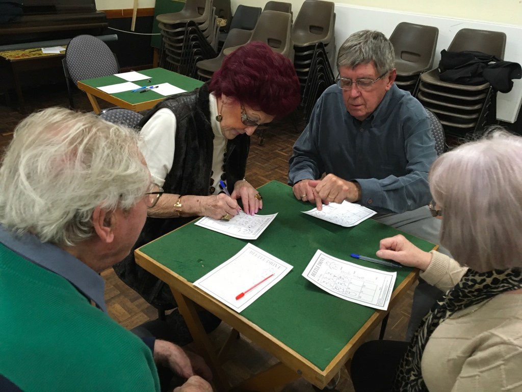 Well that was fun! A retro Beetle Drive night that brought out the competitive streak in many and howls of laughter in most. With 12 rounds, punctuated by a delicious pasty supper, chocolate brownies and teas and coffee, a good time was had by all.