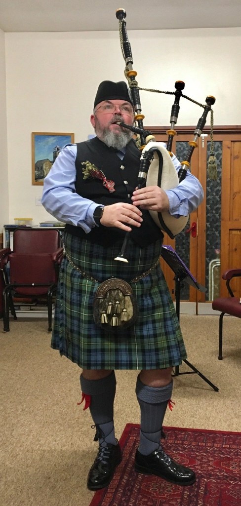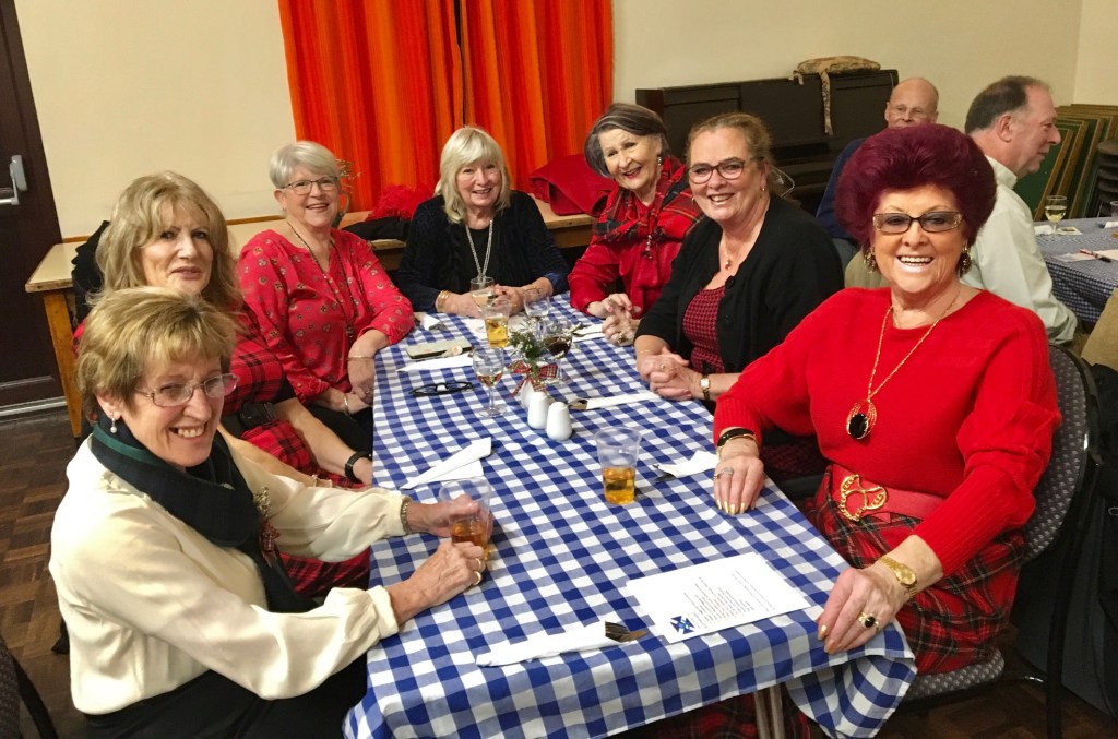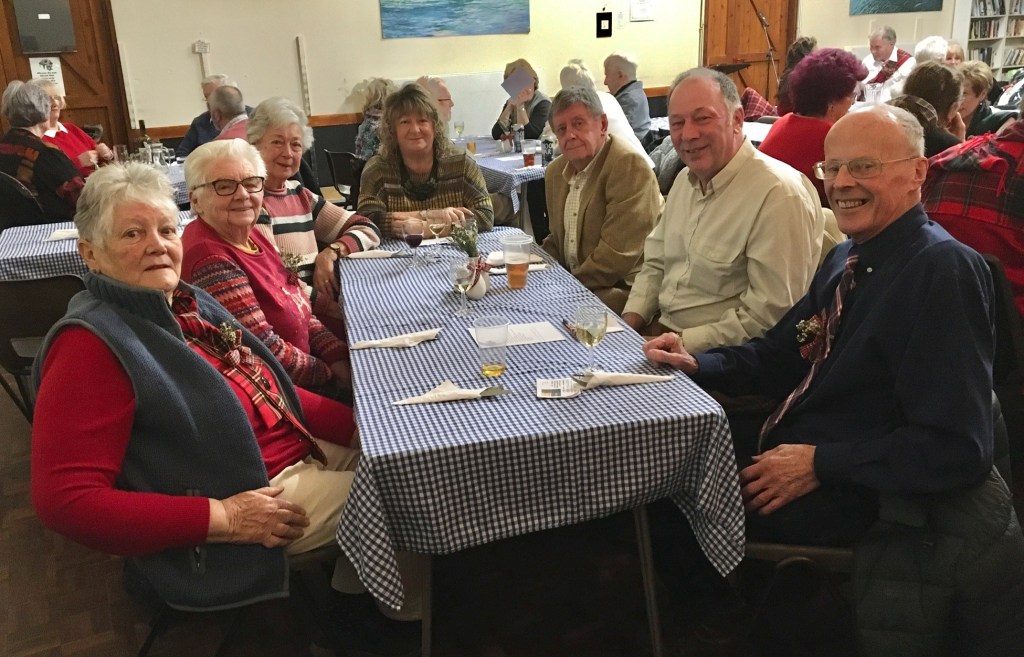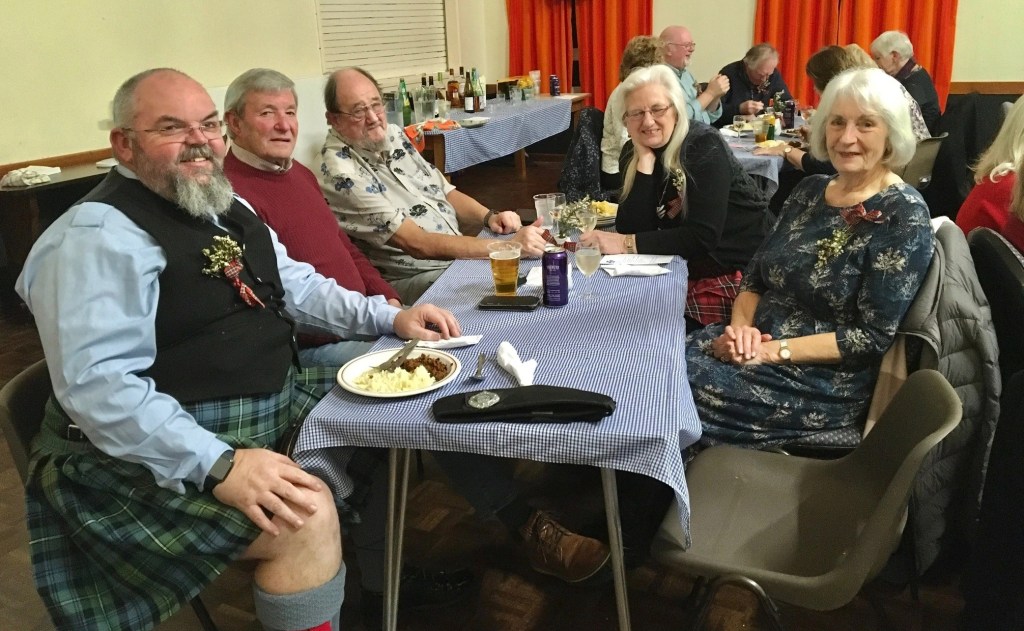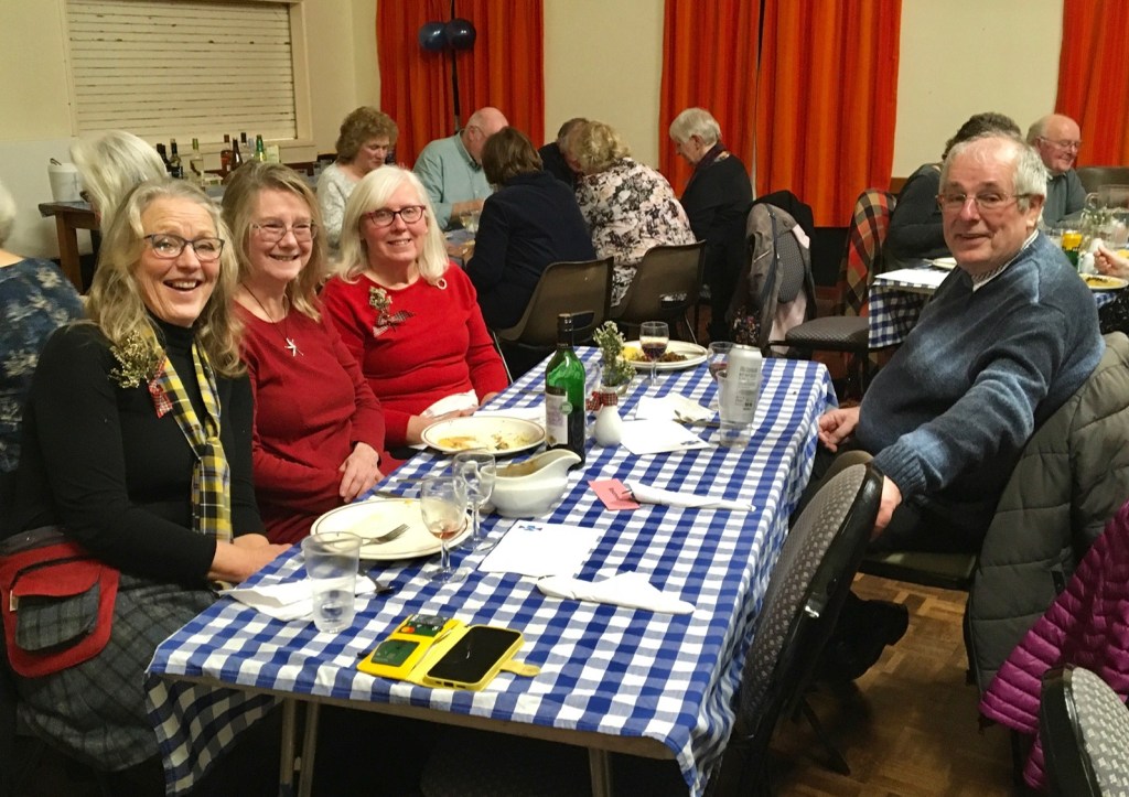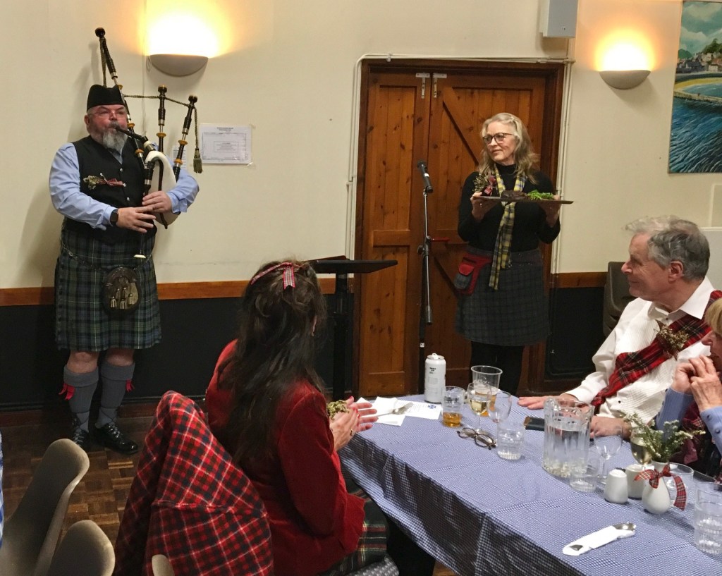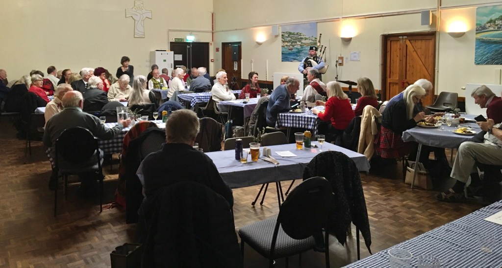 Scottish Night at Looe & District u3a had the lot! Haggis, neeps and tatties with whisky gravy prepared and served by the Committee and volunteers, freshly made Cranachan and a bar serving all the usual beverages along with Scotch Whisky. Gordon, a Scottish piper began the evening with piping in the haggis to ‘Oh, Flower of Scotland’ and then playing other Scottish tunes whilst the members were served their meal. With stomachs full, the members were treated to more bagpipe music, poems and songs by Robert Burns performed by members and the ‘Ukelele Group’ and ‘Tunes in the Afternoon’ combined to finish the entertainment with popular Scottish songs. Another enjoyable and successful evening organised by the extremely efficient Events Team under the leadership of Chris Barwell.