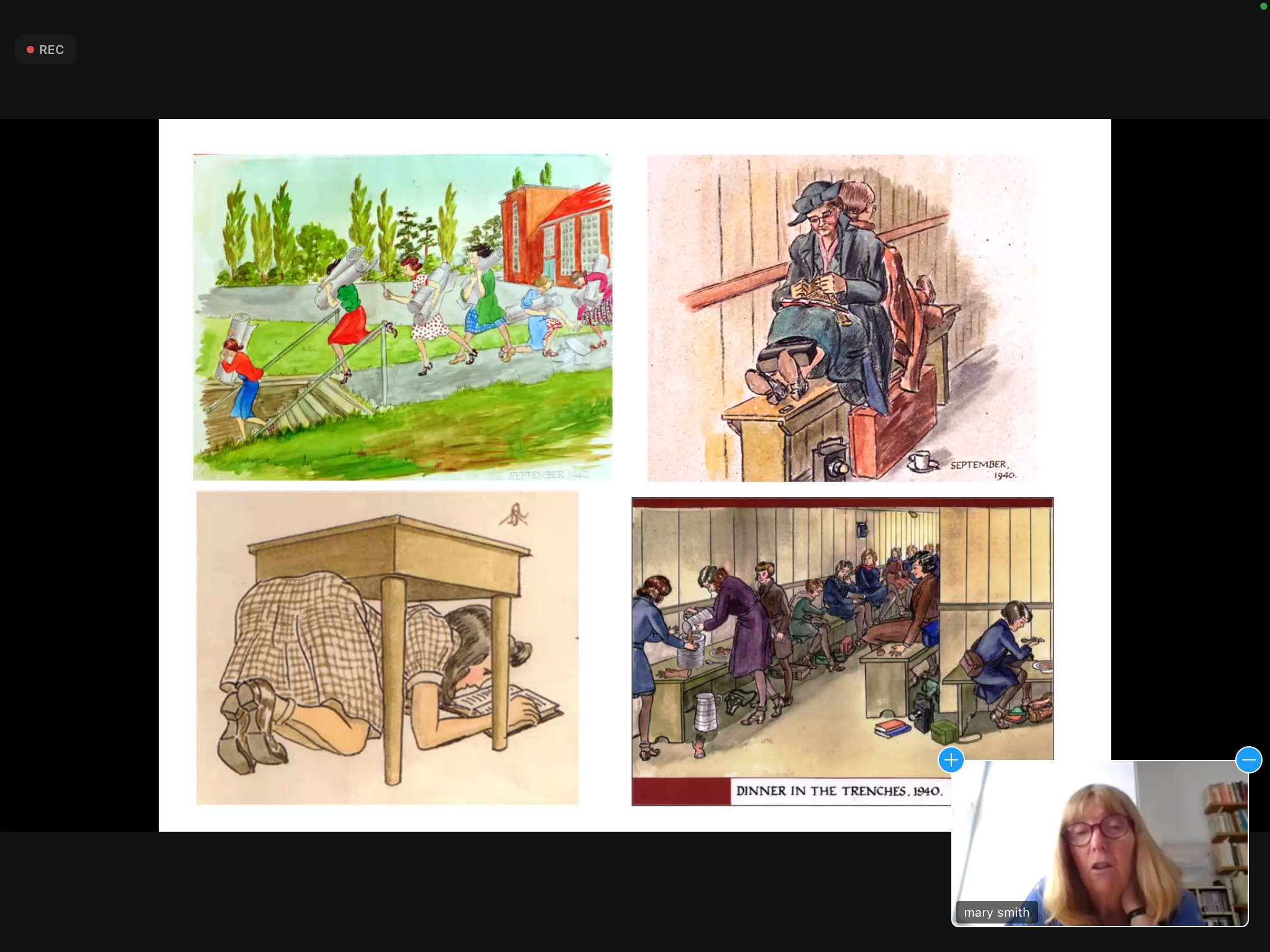 Mary Smith had been the Headteacher at Maidstone Grammar School for Girls when, as part of the 125th Anniversary of the school in 2013, it was decided to unseal the Air Raid Shelter in the school grounds that they had been aware of but unable to access in the past. The opening up of the well-preserved tunnels revealed a treasure trove of history and in particular the wonderful pictorial War Diary of the then art teacher, a Miss Helen Keane who had recorded the events of life in the school throughout the war in detailed pen and ink drawings and beautiful paintings.